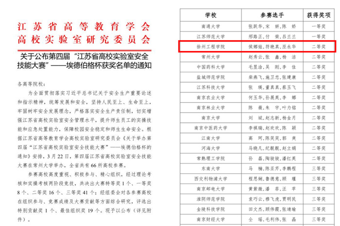 近日,第四届江苏省高校实验室安全技能大赛圆满落幕。本次大赛由江苏省高等教育学会高校实验室研究委员会主办、常州大学承办,吸引了全省66所高校代表队同台竞技。扫雷网页版 侯娜娃、符艳真、巫永华三位教师组成的代表队荣获大赛二等奖,彰显扫雷网页版 在实验室安全管理工作中的扎实成效。