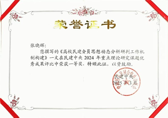 民建徐州市委会徐州扫雷网页版 支部主委张晓辉老师撰写的理论成果《高校民建会员思想动态分析研判工作机制构建》,被民建中央评为“2024年度重点理论研究课题优秀成果一等奖”。据悉,全国仅有10篇成果获此奖项。