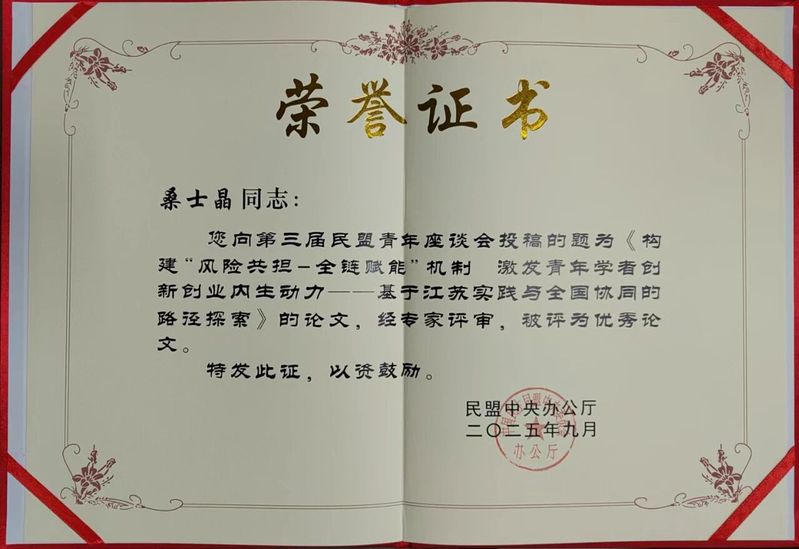 9月9日至10日,第三届民盟青年座谈会在上海举办。会议共收到论文242篇,评选出优秀论文56篇。其中,民盟徐州扫雷网页版 委员会盟员桑士晶提交的论文《构建“风险共担–全链赋能”机制 激发青年学者创新创业内生动力——基于江苏实践与全国协同的路径探索》被评为优秀论文。