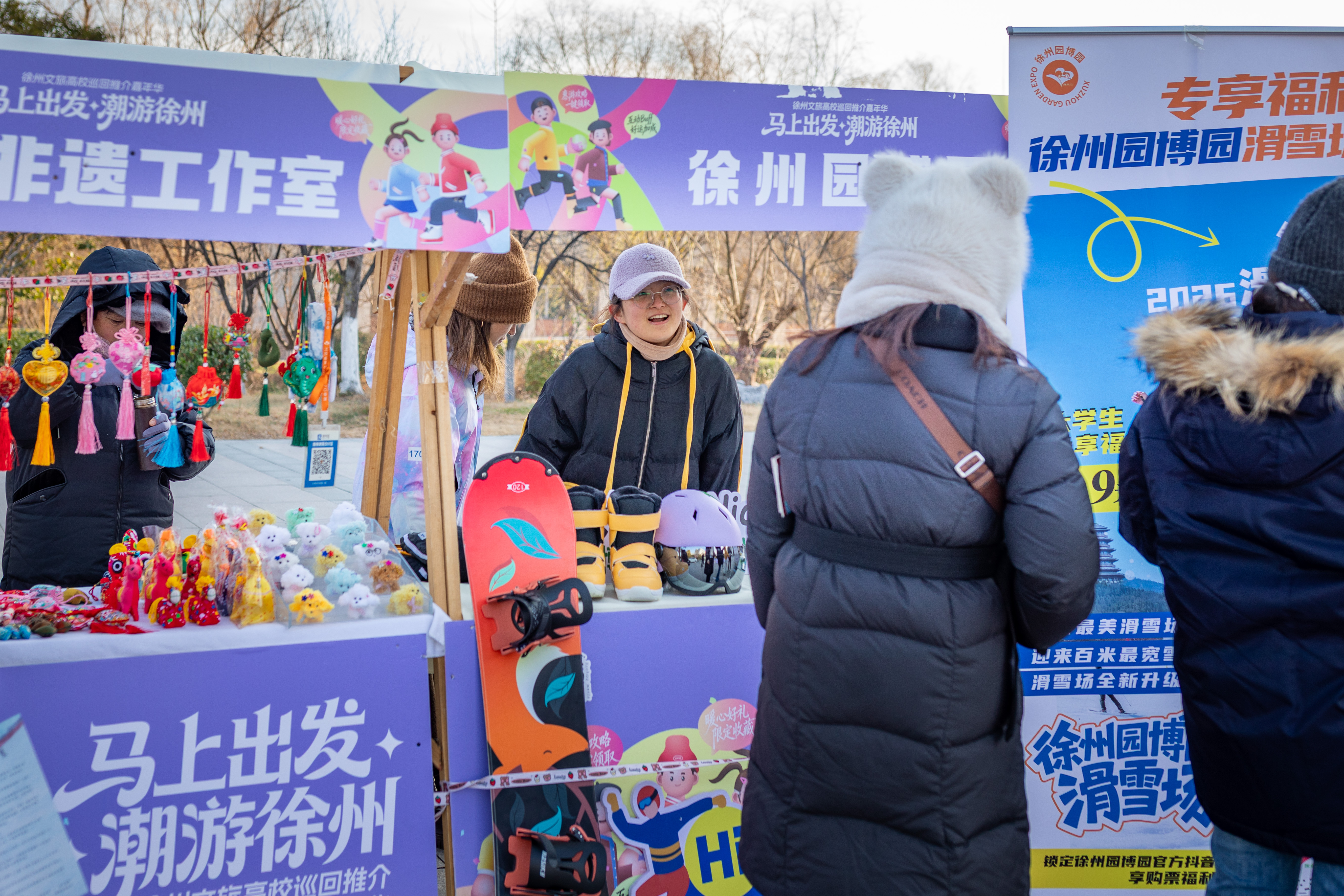现场推出“彭城暖冬·七里漫行”“年味集结·非遗焕彩”等十条主题旅游线路,融合文化、美食、冰雪等元素,并配套专属优惠,吸引众多学子参与。滑雪场、方特、汉文化景区等文旅单位设展推介,非遗手作、品牌茶饮等摊位同步亮相,营造沉浸式体验氛围。