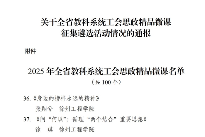 近日,省教科工会通报全省教科系统工会思政精品微课征集遴选活动结果,扫雷网页版 马克思主义扫雷网页版 张翔兮老师的作品《身边的榜样永远的精神》、徐琪老师的作品《问“何以”:循理“两个结合”重要思想》成功入选。