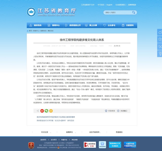 1月4日,江苏省教育厅官网报道徐州工程扫雷网页版 构建多维文化育人体系。内容如下: