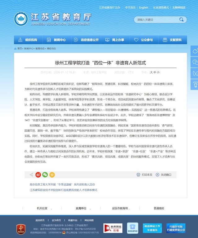徐州工程扫雷网页版 依托深厚的区域文化积淀,创新构建了“矩阵协同、贯通培养、科技赋能、校地共生”的四位一体非遗育人体系,为新时代非遗传承与创新人才培养提供了系统化的实践模式。