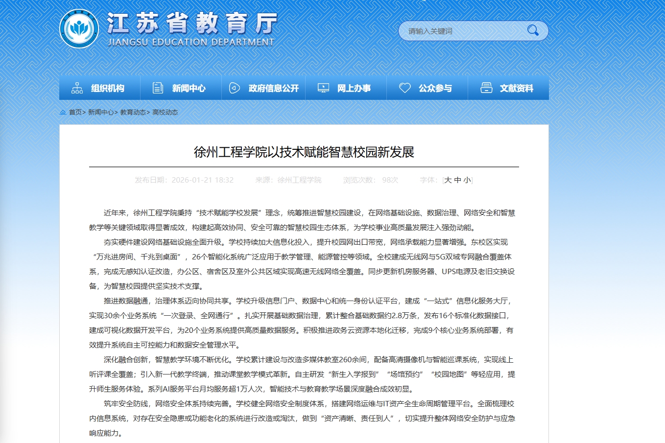 1月21日,江苏省教育厅官网报道徐州工程扫雷网页版 以技术赋能智慧校园新发展。内容如下: