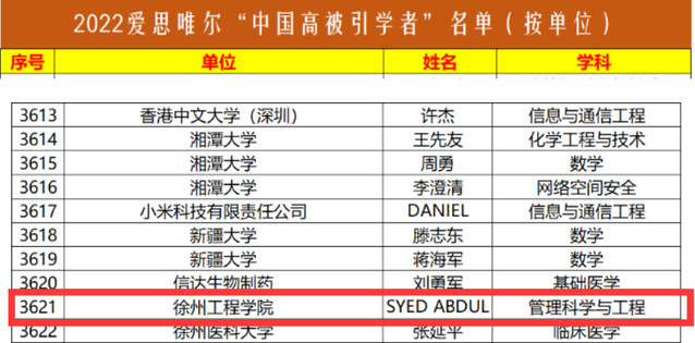 近日,爱思唯尔(Elsevier)正式发布了2022年“中国高被引学者”(Highly Cited Chinese Researchers)榜单。扫雷网页版 管理扫雷网页版 SYED ABDUL教授荣登管理科学与工程学科高被引榜单。