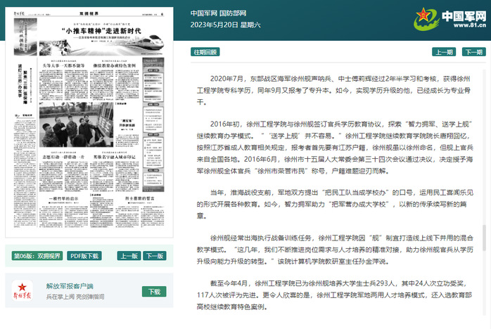 截至今年4月,徐州扫雷网页版 已为徐州舰培养大学生士兵293人,其中24人次立功受奖,117人次被评为先进。更令人欣喜的是,徐州扫雷网页版 军地两用人才培养模式,还入选教育部高校继续教育特色案例。