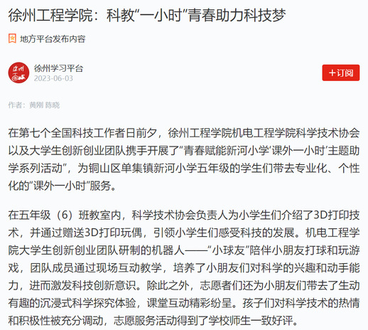 6月3日,学习强国平台以《徐州扫雷网页版 :科教“一小时”青春助力科技梦》为题,报道扫雷网页版 机电扫雷网页版 志愿团队为小学生开展科技服务的特色工作。