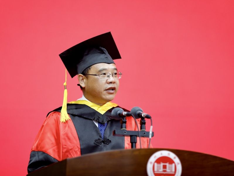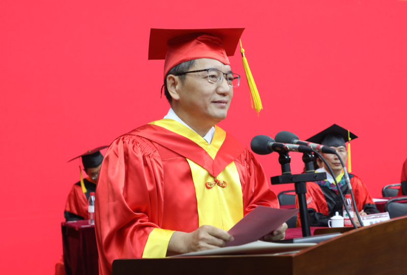 上午九时整,典礼在庄严的国歌声中拉开帷幕。校学位评定委员会主席、校长张农在毕业典礼上致辞。张校长与大家共同回顾了四年来砥砺奋进的辉煌成就;回顾了封校抗疫、校区搬迁期间,大家面对困难、面对挑战的团结与坚毅。临别之际,张农校长寄语毕业生们要有责任担当,要持续奋力拼搏,要继续学习开拓创新,他真诚希望同学们能够逐光而行,涵养幸福人生。