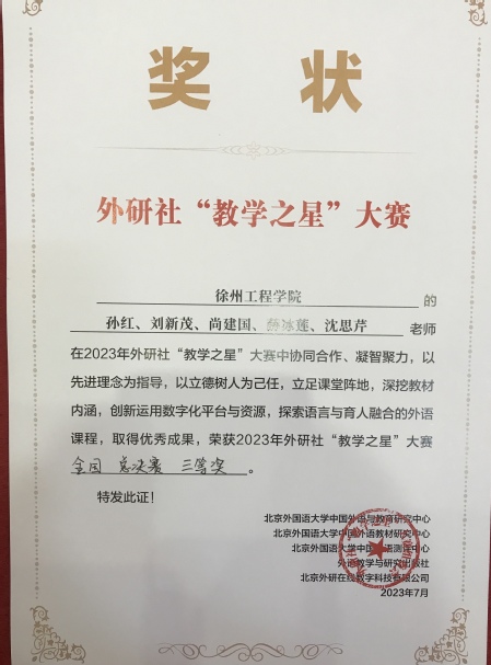 近日, 2023年外研社全国高校外语教师“教学之星”大赛在陕西西安落下帷幕。扫雷网页版 外国语扫雷网页版 孙红、刘新茂等老师组成的教学团队荣获全国总决赛三等奖,创外国语扫雷网页版 教学比赛历史最好成绩。