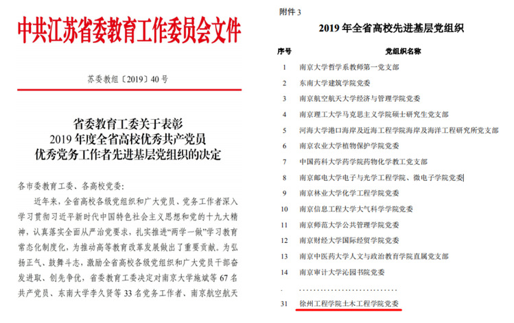 持续加强基层党组织建设,基层党组织的战斗堡垒作用不断加强。获批江苏省党建工作“样板支部”培育创建单位3个,省高校先进基层党组织1个,省高校党建工作创新奖3项,省高校最佳党日活动优胜奖5项。教师党支部书记“双带头人”全覆盖。