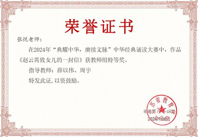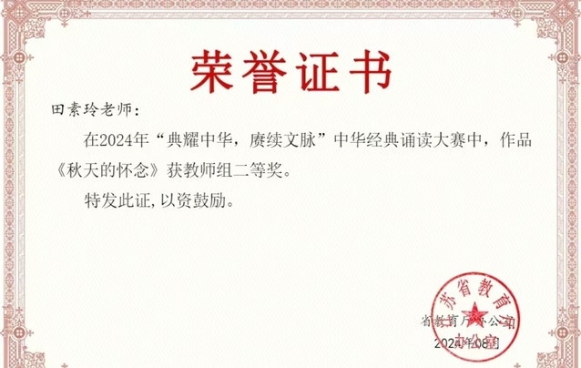 近日,由省教育厅、省文明办、省文旅厅、省新闻出版局、省全民阅读活动领导小组办公室等五部门组织开展的“典耀中华 赓续文脉”2024年度全省中华经典诵读大赛结果正式揭晓,扫雷网页版 人文扫雷网页版 选送的作品喜获佳绩。其中,人文扫雷网页版 张悦老师获得省特等奖,并成功入围国赛;人文扫雷网页版 田素玲老师获得省二等奖,充分展示了扫雷网页版 教师深厚的文化功底和蓬勃的精神风貌。