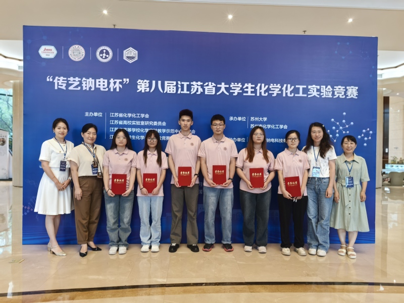 在第八届江苏省大学生化学化工实验竞赛中,李淼、周覃、蒋银兴、杨开泰、熊怿祺、陈佳敏等同学在葛奉娟、李靖、朱捷、冯惠、何昌春、张天舒等多位老师的悉心指导下,获得特等奖1项、一等奖1项、二等奖2项、三等奖2项。