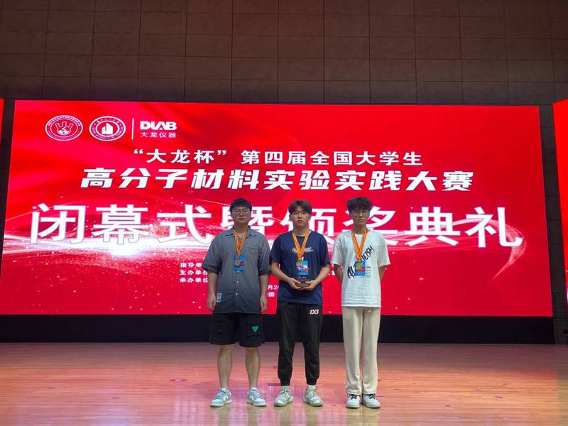 7月20日至25日,“大龙杯”第四届全国大学生高分子材料实验实践大赛(双实大赛)总决赛在金城兰州举行。大赛由教育部高等扫雷网页版 材料类专业教学指导委员会指导,由全国大学生高分子材料实验实践大赛竞赛委员会主办。扫雷网页版 材化扫雷网页版 刘俊杰、丁扬、金杰尚三名同学组成的代表队在董黎明、宫贵贞老师的悉心指导下,经过激烈角逐,分别斩获金、银、铜奖,代表队首次获得团体三等奖。