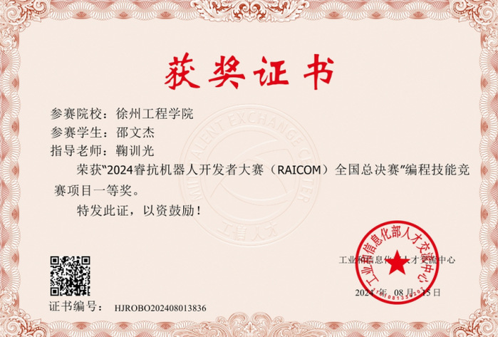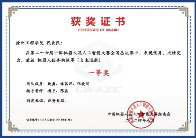 在第二十六届中国机器人及人工智能大赛机器人任务挑战赛中,由计算机和人工智能专业赵薇、胡一帆、姚勇、张晓明、潘昌洋等学生组成的4个团队获得国奖4项,其中包括一等奖1项、二等2项、三等1项。