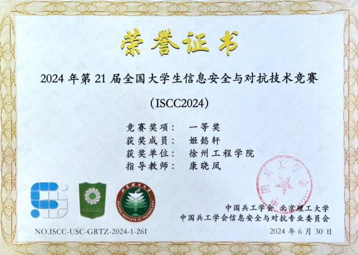 在第21届信息安全与对抗技术竞赛(ISCC 2024)中,来自计算机专业的王宇、人工智能专业的姬懿轩等40名学生参赛,再次展现了出色的技术实力,获得国奖15项,其中包括一等奖1项、二等奖5项、三等奖9项。