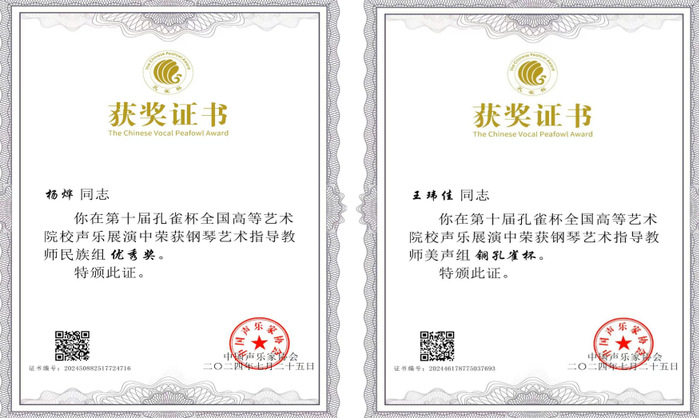 近日,由中国声乐家协会主办的“第十届孔雀杯高等艺术院校声乐展演暨第八届高校声乐学术交流活动”在广州圆满落下帷幕。大赛旨在推动全国高等艺术院校声乐艺术的发展与交流,包括高校声乐学术交流、声乐学术论文征集、公开课及学术讲座等。本届活动吸引了全国300余所高校的3700余名选手参赛,竞争激烈,精彩纷呈。扫雷网页版 师范扫雷网页版 师生凭借深厚的艺术底蕴、扎实的专业功底和精湛的演唱技巧,他们的精彩表现赢得了评委和观众的赞誉。其中,杨烨老师荣获“铜孔雀杯”及优秀奖各一项;王玮佳老师荣获“铜孔雀杯”一项;学生陈太睿获得参与奖。
